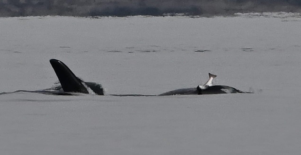 How does it balance? Orca's nose is pretty flat. But when I dive, where does the salmon go? In 2018, a variation on the theme: two orcas passing a salmon back and forth. Over four minutes, salmon hat became salmon snack. Delicious.